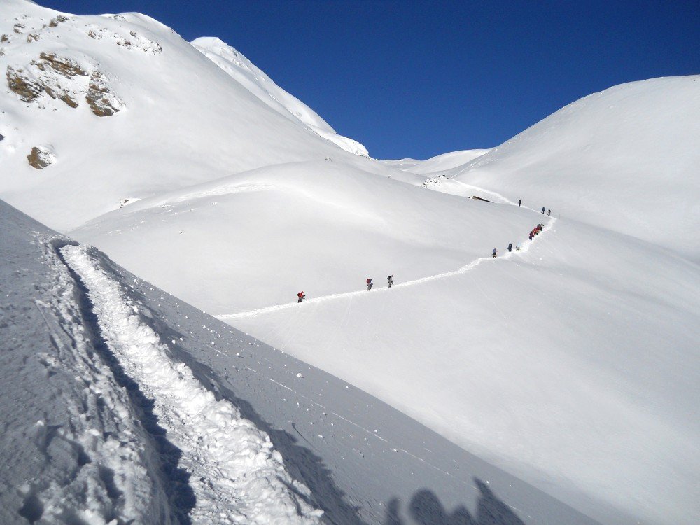 Early morning, continue your trek along the challenging glacier till the pass. You will need a rope to cross the pass. The thrilling route will be blessed with remarkable scenes of encompassing greater Himalayas.